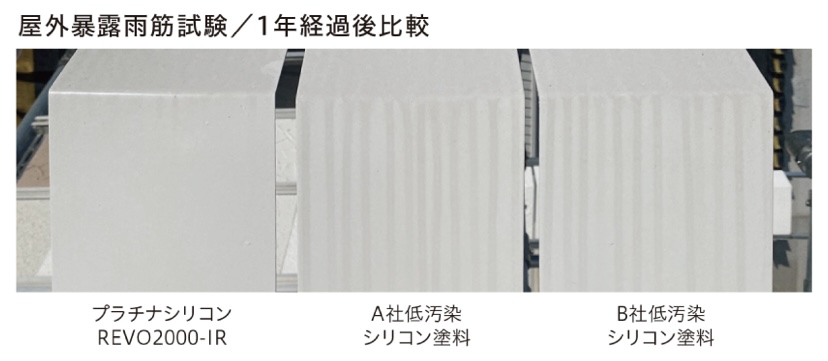 一般的な低汚染シリコン塗料と比較して雨筋汚れが付きにくく、