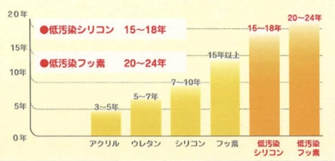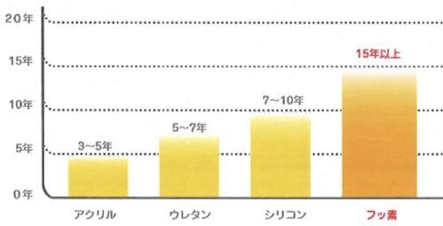 フッ素塗料は、一般的なシリコン塗料を遥かに凌ぐ高耐候性を誇ります。