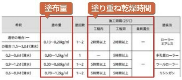 そのため、塗料メーカーが指定する基準塗布量や塗り重ね乾燥時間などの