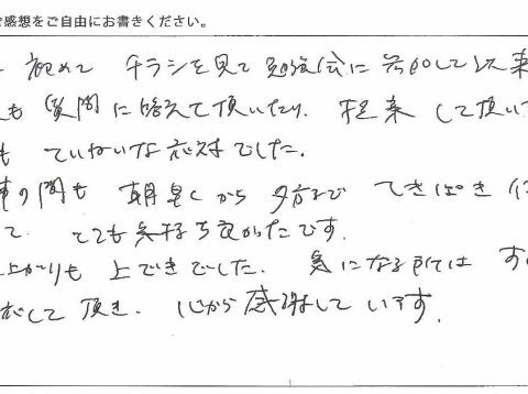 2月に初めてチラシを見て勉強会に参加して以来何度も質問に答えて頂いたり、提案して頂いたりとてもていねいな対応でした。工事の間も朝早くから夕方までてきぱき仕事されていてとても気持ち良かったです。仕上がりも上できでした。気になる所はすぐに対応して頂き、心から感謝しています。