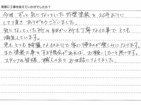 今回、ずっと気になっていた外壁塗装を20年ぶりにして頂きありがとうございました。気になっていた所や細かい所も丁寧な仕事でとても満足しています。色もとても綺麗な仕上がりで家に帰るのが楽しみになります。また塗装工事をする機会があれば、お願いしたいと思います。スタッフの皆様、職人の方々お世話になりました。
