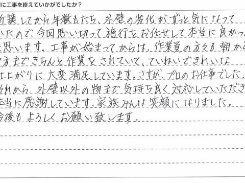 新築してから年数もたち、外壁の劣化がずっと気になっていたので、今回思い切って施工をお任せして本当に良かったと思います。工事が始まってからは、作業員の方々も朝から夕方まできちんと作業をされていて、ていねいできれいな仕上がりに大変満足しています。さすがプロのお仕事でした。それから、外壁以外の物まで気持ち良く対応していただき本当に感謝しています。家族みんな笑顔になりました。今後もよろしくお願い致します。