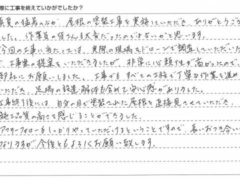 真夏の猛暑のなか、屋根の塗装工事を実施していただき、ありがとうございました。作業員の皆さんも大変だったのではないかと思います。今回の工事に当たっては、実際の現場をドローンで調査していただいた上で、工事案をいただきましたが、非常に信頼性が高かったので、御社にお願いしました。工事でもすべての工程で丁寧な作業を進めていただき、足場の設置・解体も含めて安心感がありました。工事終了後はには、自分の目で塗装された屋根を直接見させていただき、施工品質の高さを感じることができました。アフターフォローもしっかりやっていただけるということですので、長いおつき合いになりますが、今後ともよろしくお願い致します。