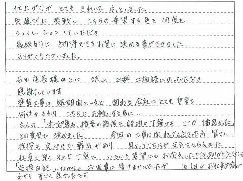 仕上がりがとてもきれいでホッとしました。色選びに苦戦しこちらの希望する色を何度もシミュレーションしていただき最終的に納得できるお色に決める事ができました。ありがとうございました。