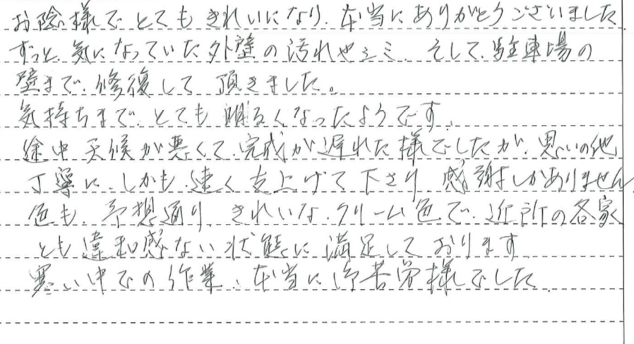 お陰様でとてもきれいになり、本当にありがとうございました。ずっと気になっていた外壁の汚れやシミ、そして駐車場の壁まで、修復して頂きました。気持ちまでとても明るくなったようです。途中天候が悪くて完成が遅れた様でしたが思いの他丁寧にしかも速く仕上げて下さり感謝しかありません。色も予想通りきれいなクリーム色で近所の各家とも違和感ない状態に満足しております。寒い中での作業、本当にご苦労様です。