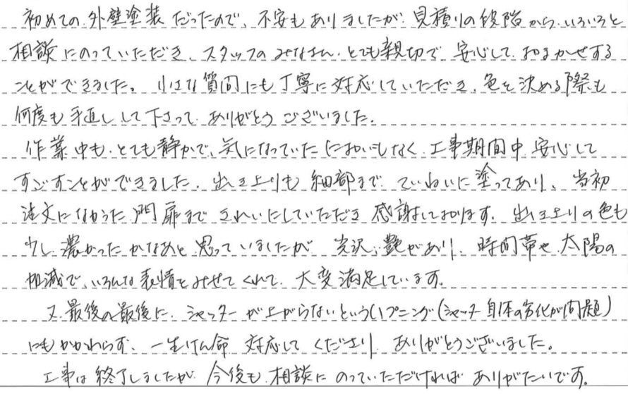 初めての、外壁塗装だったので、不安もありましたが、見積りの段階からいろいろと相談にのっていただき、スタッフのみなさん、とても親切で安心しておまかせすることができました。小さな質問にも丁寧に対応していただき、色を決める際も何度も手直しして下さって、ありがとうございました。作業中もとても静かで、気になっていたにおいもなく工事期間中安心してすごすことができました。出き上がりも細部までていねいに塗ってあり、当初注文になかった門扉まできれいにしていただき感謝しております。出き上がりの色も少し濃かったかなあと思っていましたが光沢、艶があり、時間帯や太陽の加減で、いろんな表情をみせてくれて、大変満足しています。又最後の最後にシャッターが上がりないというハプニング(シャッター自体の劣化が問題)にもかかわらず、一生懸命対応してくださりありがとうございました。工事は終了しましたが今後も相談にのっていただければ