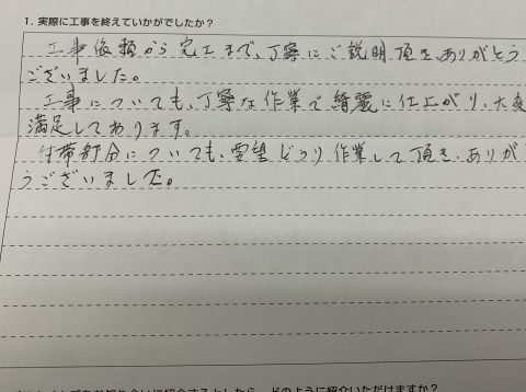 工事後頼から完工まで、丁寧にご説明頂き、ありがとうございました。工事についても、丁寧な作業で綺麗に仕上がり、大変満足しております。付帯部分についても、要望どおり作業して頂き、ありがとうございました。