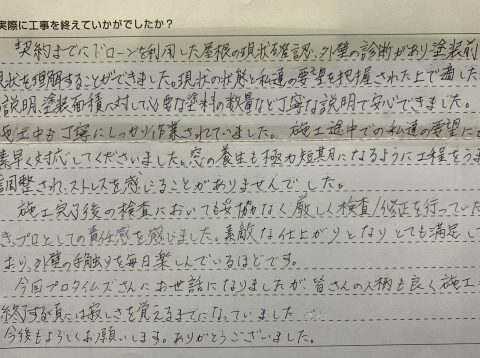契約までドローンを利用した屋根の現状確認、外壁の診断があり塗装前の現状を理解することができました。現状の状態と私達の要望を把握された上で適した塗料説明、塗装面積に対して必要な塗料の数量など丁寧な説明で安心できました。施工中も丁寧にしっかり作業されていました。施工途中での私達の要望にも素早く対応してくださいました。窓の養生も極力短期になるように工程をうまく調整され、ストレスを感じることがありませんでした。施工完了後の検査においても妥協なく厳しく検査/修正を行っていただき、プロとしての責任感を感じました。素敵な仕上がりとなりとして満足しており、外壁の手触りを毎日楽しんでいるほどです。今回プロタイムズさんにお世話になりましたが、皆さんの人柄も良く施工が終了する頃には寂しさを覚えるまでになっていました。今後ともよろしくお願いします。ありがとうございました。