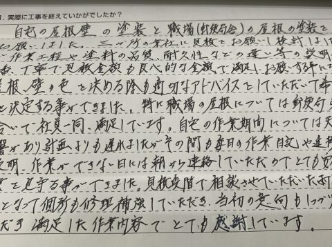 自宅の屋根の塗装と職場の屋根の塗装をお願いしました。三ヵ所の業者に見積をお願いし検討しましたが作業工程や塗料の品質、耐久性などの違い等の説明が一番、丁寧で見積金額も良心的な金額で満足し、お願いする事になりました。屋根、壁の色を決める際も適切なアドバイスをしていだだいて希望の色を決定する事ができました。特に職場の屋根については郵便局らしい色合いで社員一同、満足しています。自宅の作業期間については天候の影響があり計画よりも遅れましたがその間も毎日の作業日記や進捗状況の説明、作業ができない日には朝から連絡していただいたのでとても安心して作業を見守る事ができました。見積段階で相談させていただいた雨漏りの原因となって個所も修理補強していただき、当初の意向もしっかり対応していただき満足した作業内容でとても感謝しています。