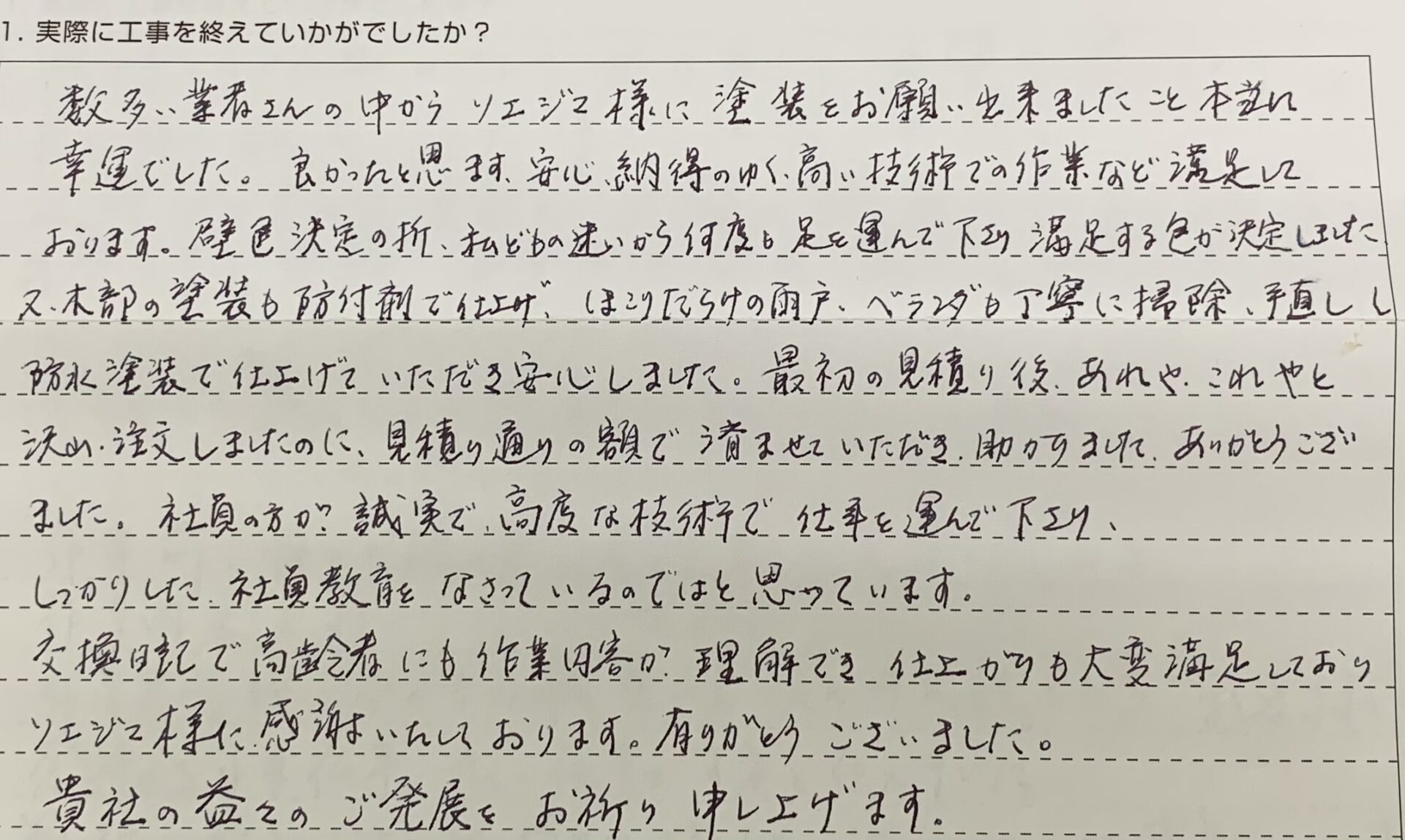 数多い業者さんの中からソエジマ様に塗装をお願いお願い出来ましたこと本当に幸運でした。良かったと思います、安心、納得のゆく、高い技術での作業など満足しております。壁色決定の折、私どもの迷いから何度も足を運んで下さり満足する色が決定しました。又、木部の塗装も防付剤で仕上げ、ほこりだらけの雨戸、ベランダも丁寧に掃除、手直しし防水塗装で仕上げていただき安心しました。最初の見積り後、あれやこれやと沢山、注文しましたのに、見積り通りの額で済ませていただき、助かりました。ありがとうございました。社員の方?誠実で高度な技術で仕事を運んで下さり、しっかりした、社員教育をなさっているのではと思っています。交換日記で高齢者にも作業内容が理解でき仕上がりも大変満足しておりソエジマ様に感謝いたしております。有りがとうございました。貴社の益々のご発展をお祈り申し上げます。
